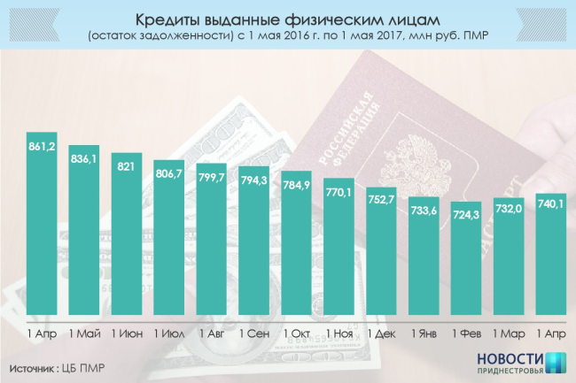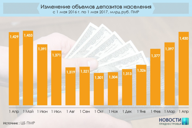 К 1 мая объем частных депозитов в ПМР составил в общей сложности почти 1 миллиард 430 миллионов рублей. Это на 33 миллиона выше, чем в апреле, и на 116 миллионов или на 8,8% больше, чем на начало года.