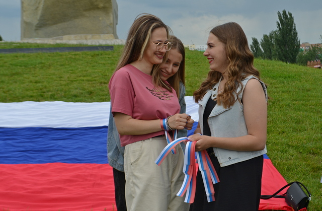 На площади Суворова развернули флаг РФ, горожанам дарили бело-сине-красные ленточки