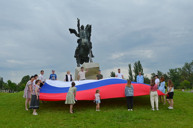 На площади им. А. В. Суворова под звуки гимна России активисты развернули флаг РФ, а затем раздали горожанам ленточки в цветах триколола. Детям по случаю праздника дарили мороженое, сообщает партийная пресс-служба.