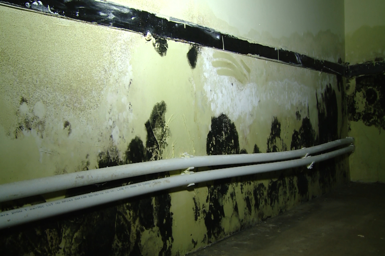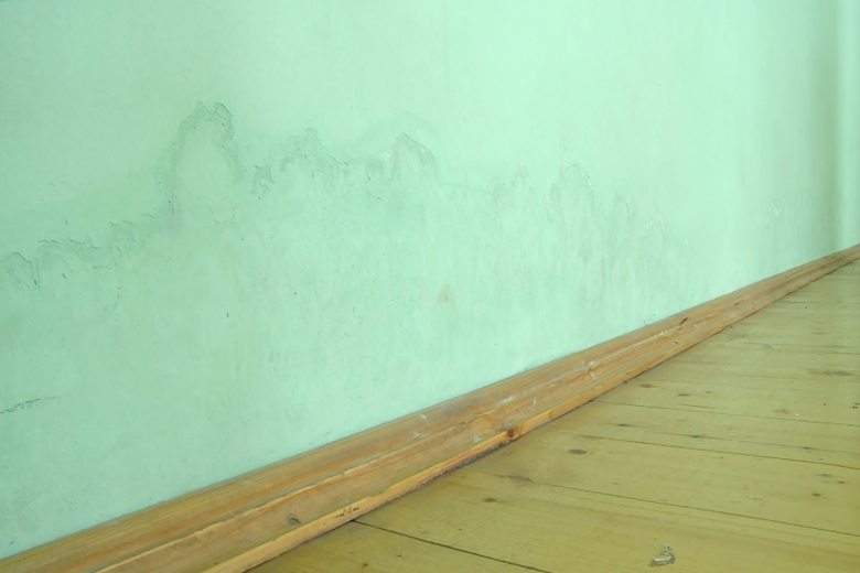 Ещё одна серьёзная проблема – это просадка здания. Из-за неё образуются щели, в которые попадает вода. По этой причине на стенах в спортзале и в подвальном помещении появились следы влаги, а в подвале – плесень. По словам администрации школы, некоторые пятна плесени и влаги образовались относительно недавно. Комиссия отметила, что этот факт говорит о прогрессировании дефектов.