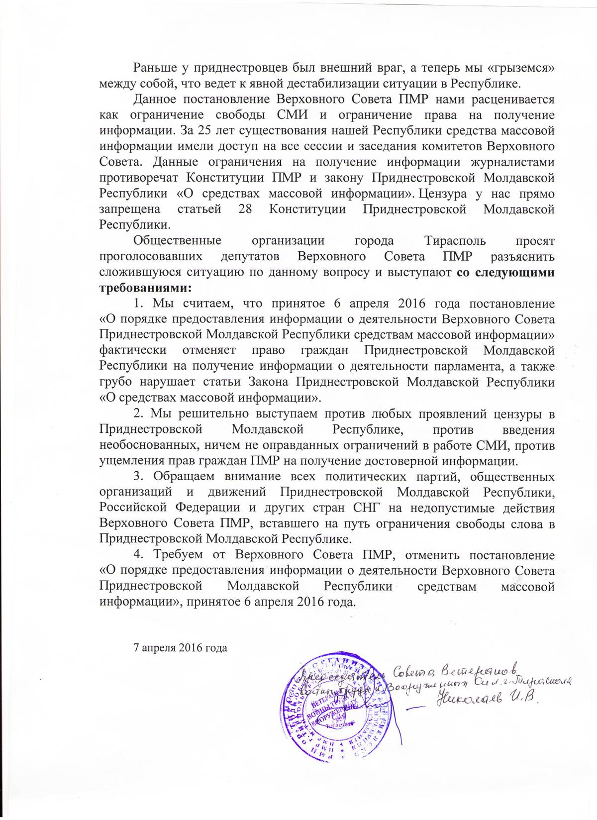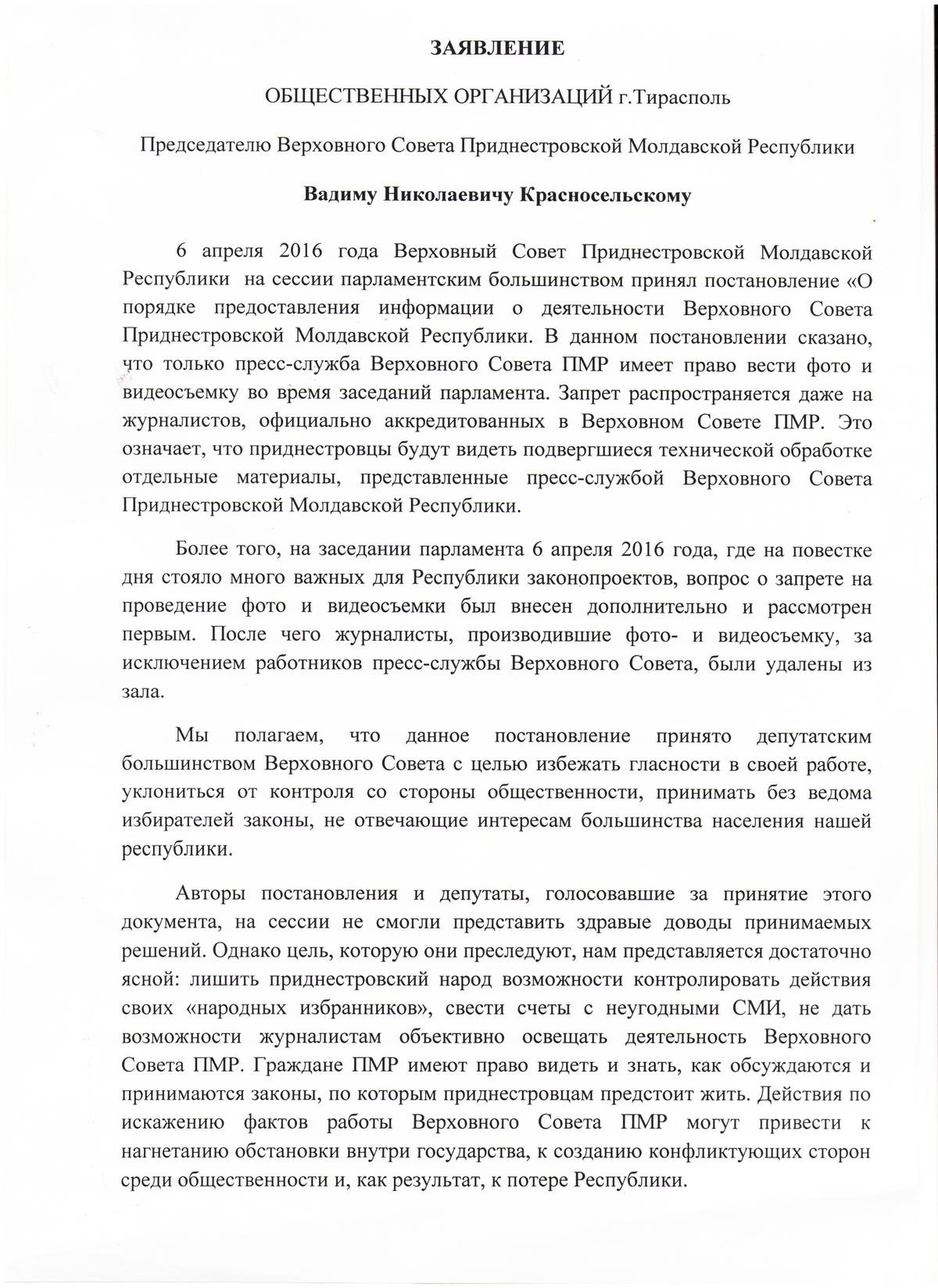 В заявлении общественники призывают депутатов отменить принятое 6 апреля постановление «О порядке предоставления информации о деятельности Верховного Совета Приднестровской Молдавской Республики», которым СМИ, за исключением парламентской пресс-службы, запрещается вести фото- и видеосъемку во время заседаний законодательного органа.