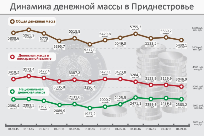Однако в общем объёме денежной базы количество средств в иностранной валюте по-прежнему превышает объём наличных и безналичных приднестровских рублей. По состоянию на 1 сентября на иностранную валюту приходится 56,1% от общего объёма денежной базы, а на наличные и безналичные рубли 43,9%.