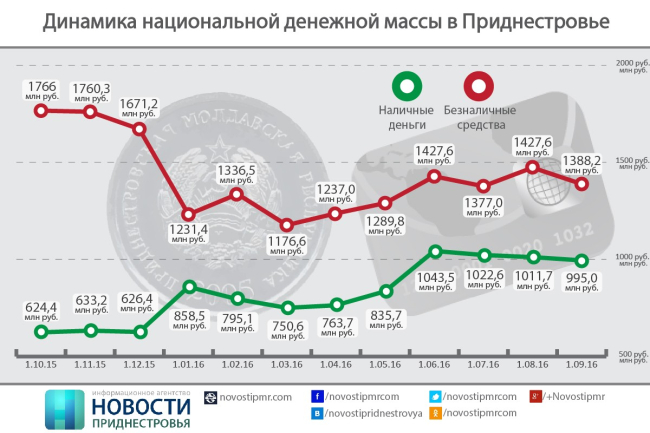 Тирасполь, 13 сентября. /ИА «Новости Приднестровья"/. В Приднестровье продолжают снижаться объёмы денежной базы. Как сообщается на официальном сайте Приднестровского Республиканского Банка, количество наличных денежных средств, находящихся в обращении на территории ПМР, сократилось с 1 млрд 11,7 млн рублей (на 1 августа 2016 года) до 995 млн (на 1 сентября 2016) года, т. е. на 1,7%. Количество безналичных рублей сократилось с 1 млрд 427,6 млн до 1 млрд 388,2 млн (-2,8%).