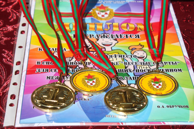 Участники «Веселых стартов», используя спортивный инвентарь, состязались в метании «гранат» на точность, оказании медицинской помощи, переносе «снарядов» и преодолении «минного поля».