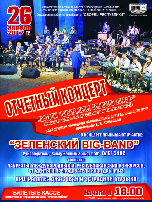 Тирасполь, 25 апреля. /Новости Приднестровья/. 26 апреля в 18:00 в большом зале Дворца Республики пройдёт отчетный концерт кафедры «Музыкальное искусство эстрады» Приднестровского государственного института искусств (ПГИИ).