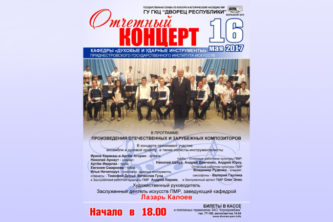 Тирасполь, 15 мая /Новости Приднестровья/. 16 мая во Дворце Республики свой отчётный концерт представят музыканты кафедры «Духовые и ударные инструменты» Приднестровского государственного института искусств. В его программу войдут произведения отечественных и зарубежных композиторов, которые сыграют ансамбли, духовой оркестр, а также солисты-инструменталисты вуза.