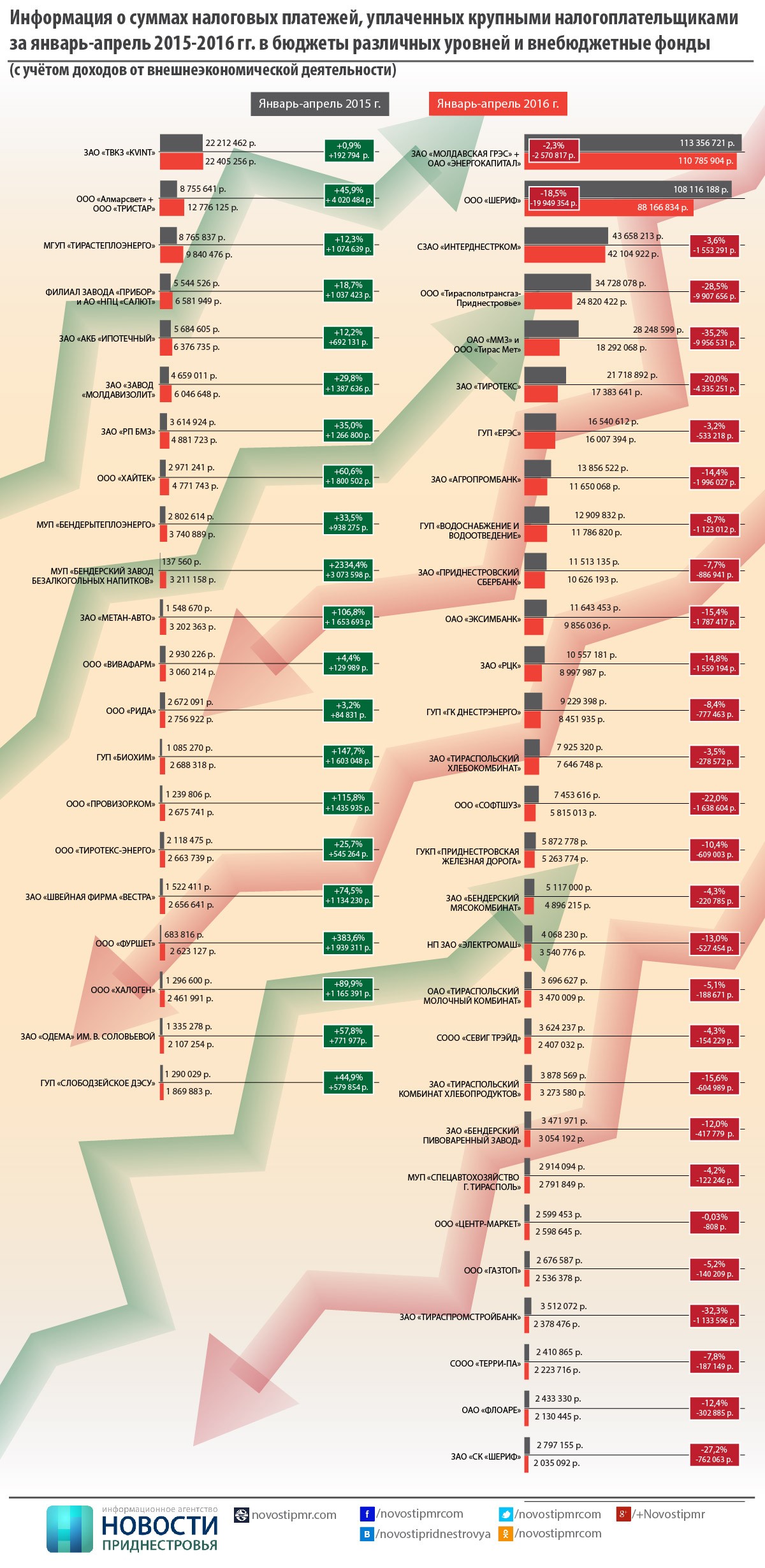 В денежном выражении самый большой рост показали фирмы «Алмарсвет» и «Тристар» (они перечислили больше на 4 млн рублей), а также Бендерский завод безалкогольных напитков (+3 млн).