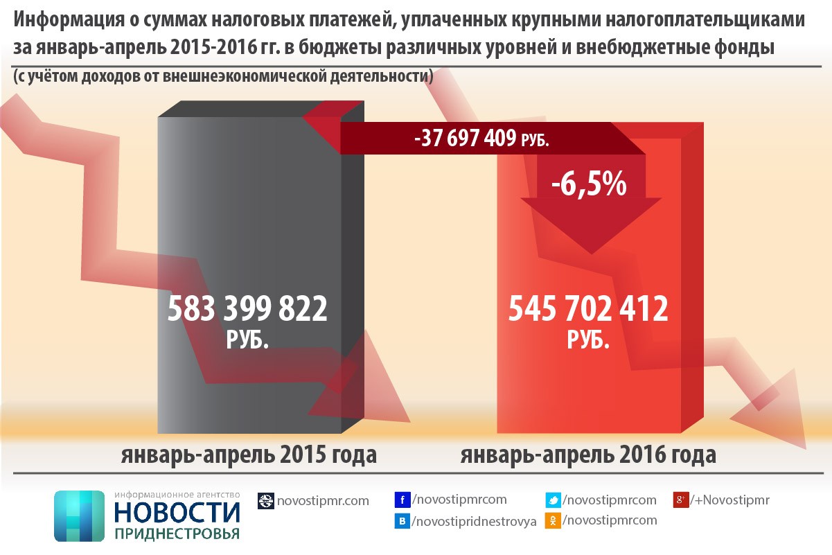 По сравнению с прошлым годом, крупнейшие налогоплательщики в январе-апреле 2016-го снизили выплаты на 38 млн рублей
