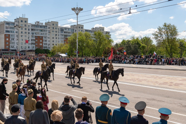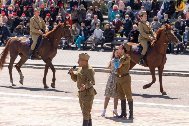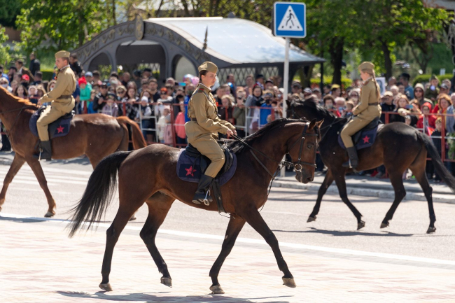Кавалерийское дефиле является одним из наиболее ярких и запоминающихся моментов парада. На этот раз наездницы были в форме времен Великой Отечественной войны. В их рядах и те, чьи деды и прадеды ковали победу в 1941-1945 гг.