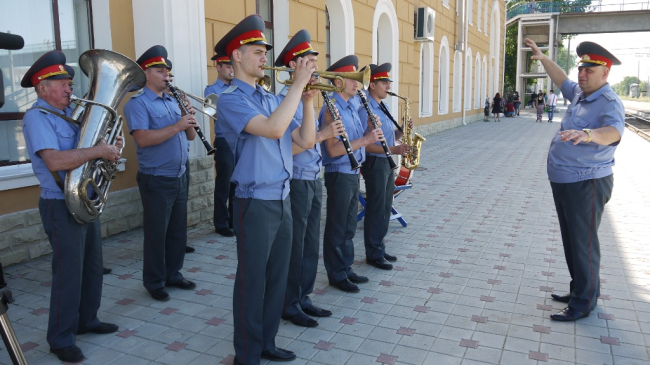 Тирасполь, 11 июня. /Новости Приднестровья/. В канун Дня России на перроне железнодорожного вокзала столицы Приднестровья оркестр Министерства внутренних дел с музыкой встречал пассажиров поезда «Москва-Кишинёв».