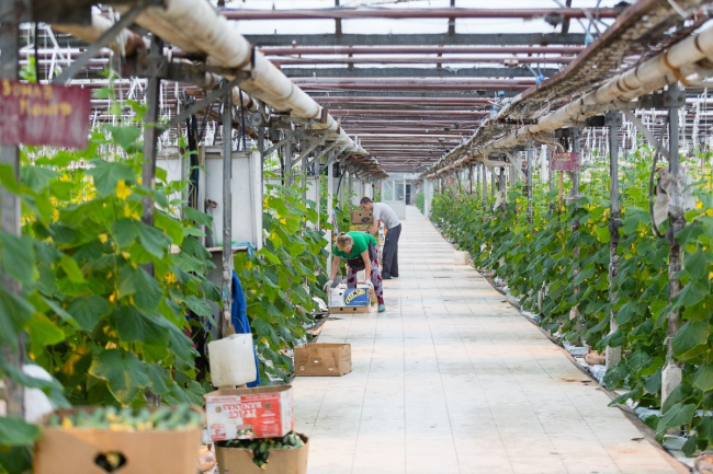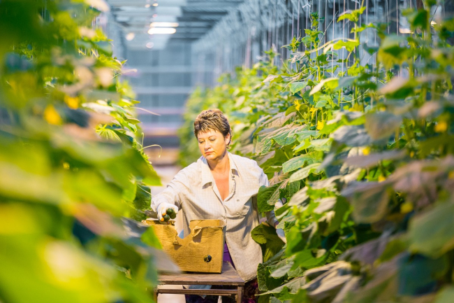 Первые ящики с салатным огурцом уже ушли в торговые сети и на рынки. С одного квадратного метра получается 13-14, максимум 16 кг, то есть в зимний сезон – до конца мая – здесь планируют собрать примерно 350-400 тонн. В следующем – осеннем – обороте урожай обычно меньше – порядка 3-5 кг с метра.