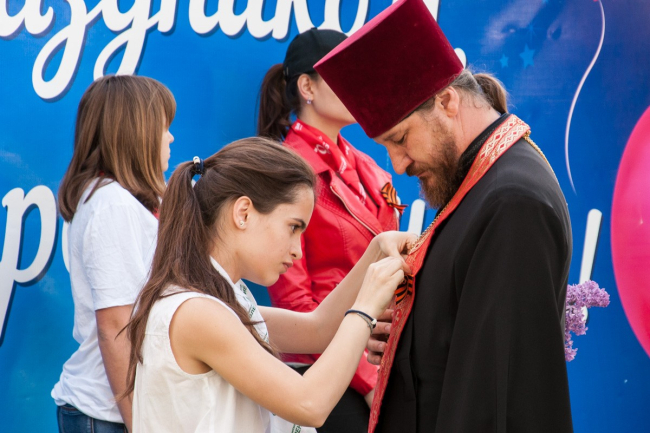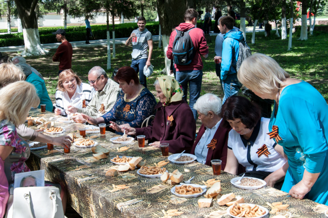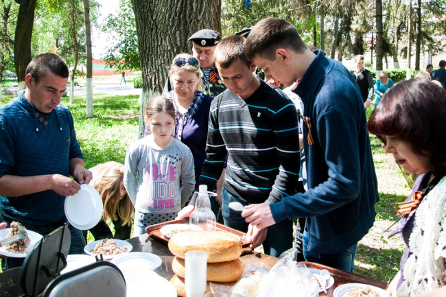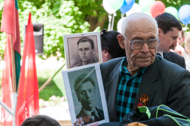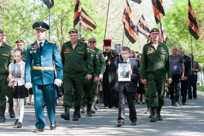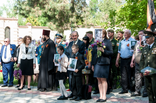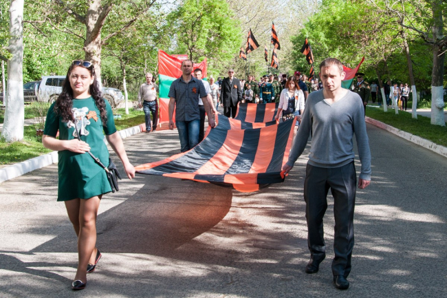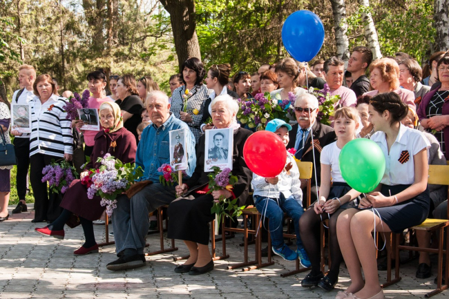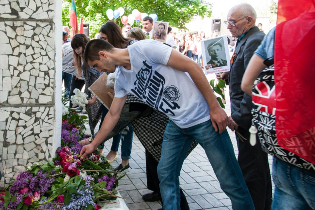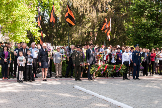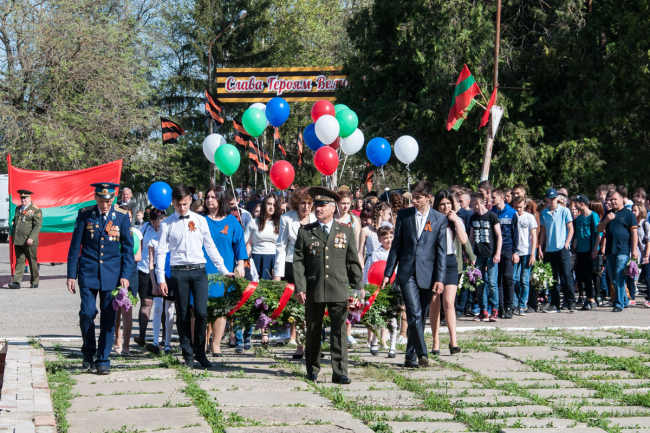 В этом году праздник начался с молебна. Память всех, кто погиб в Великой Отечественной войне, почтили на месте будущего храма. После этого по центральной улице прошёл «Бессмертный полк». Показать портреты своих родных — тех, кто встречал самый первый День Победы и тех, кто так никогда и не увидел его, — вышли жители посёлка, студенты, казаки, представители российской и приднестровской армий и, конечно же, школьники. «Это мой прапрадедушка, он был грузчиком, доставлял продукты, оружие, пули, чтобы помогать другим. Спас много жизней, много детей и женщин», — рассказывает Данил Науменко.