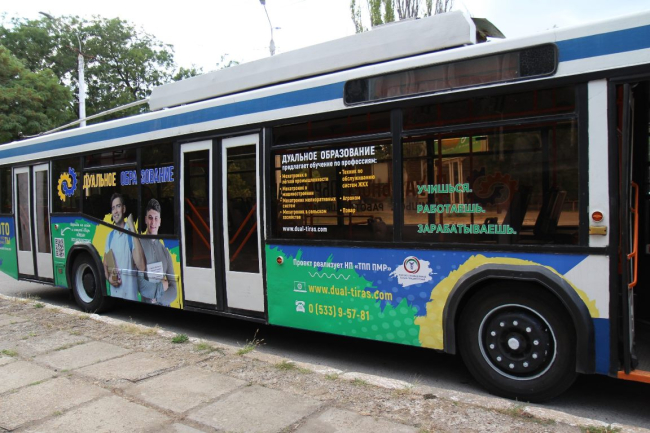 Тирасполь, 11 сентября. /Новости Приднестровья/. По Тирасполю и Бендерам курсирует троллейбус с рекламой дуального образования. Напомним, это проект, предусматривающий акцент на практических занятиях во время обучения той или иной специальности.