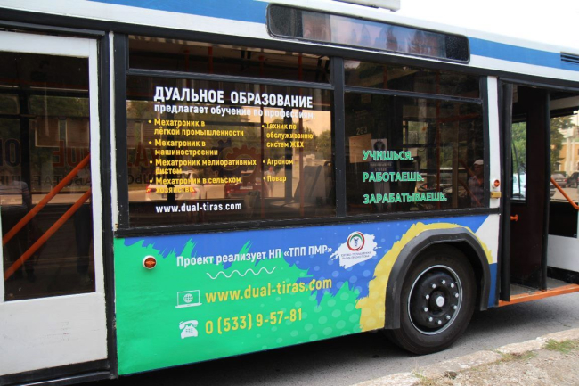 Он будет ходить по разным маршрутам: № 1, № 2, № 3, № 4, № 6, № 7, № 19 и № 19 «а». Благодаря такому разнообразию каждый житель Тирасполя и Бендер может получить информацию о практико-ориентированной (дуальной) системе обучения. Можно не только ознакомиться с разнообразием профессий, но и перейти по QR-коду на сайт дуального образования для получения более подробной информации об образовательных заведениях, в которых обучают по практико-ориентированной системе.