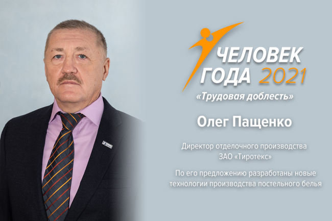 Тирасполь, 26 февраля. /Новости Приднестровья/. Заслуженную награду в номинации «Трудовая доблесть» конкурса «Человек года – 2021» получил директор отделочного производства ЗАО «Тиротекс» Олег Пащенко.