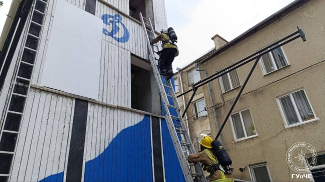 Второй этап проходил на учебной башне. Пожарным нужно было подняться по лестнице, а затем эвакуировать «пострадавшего» с третьего этажа.