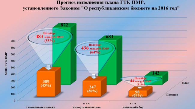 Принимая во внимание продолжающуюся тенденцию снижения внешнего товарооборота ПМР, в таможенном комитете прогнозируют на конец 2016 г. исполнение плановых показателей только на уровне 45%. В результате недобор платежей, поступающих в республиканский бюджет, может превысить 483 млн руб.