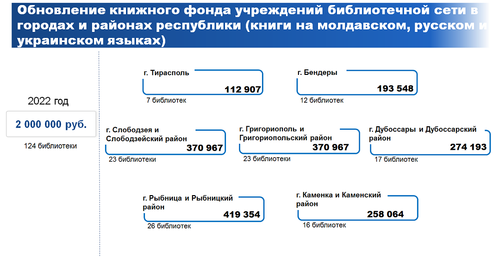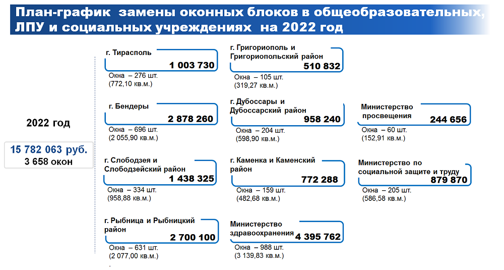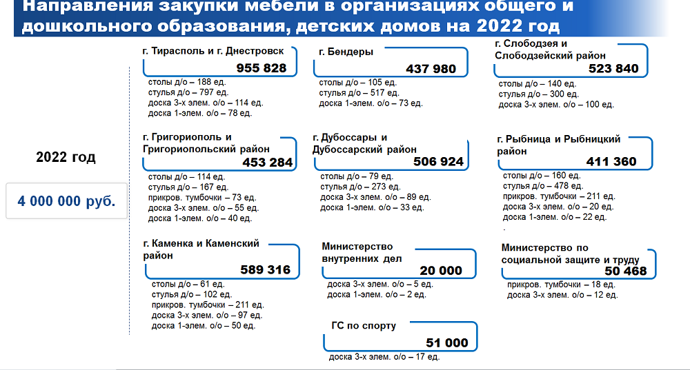 Еще одна новая для 2022 года - программа обновления мебели в организациях общего и дошкольного образования, детских домах на 2022-2025 годы. Она разработана по поручению Президента ПМР. Общая сумма на реализацию программы – 131 млн руб. На 2022-й год планируется потратить 4 млн рублей. На эти средства закупят столы, стулья, прикроватные тумбочки для детских садов, одно- и трехэлементные доски для школ.