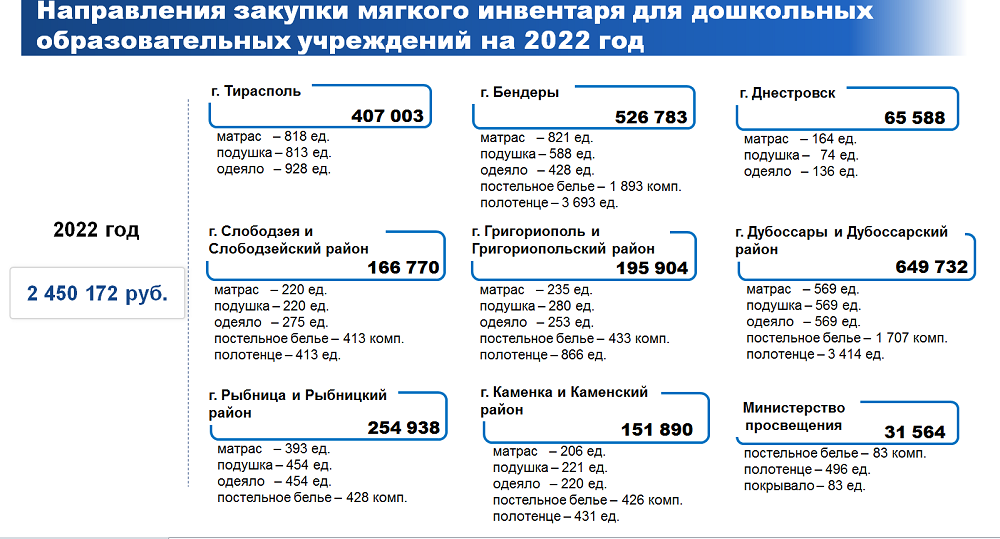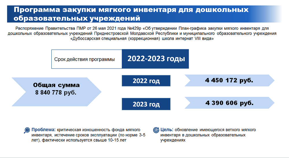 «Включение данной Программы в смету расходов Фонда капитальных вложений позволит обеспечить на 25% потребность в обновлении мягкого инвентаря дошкольных образовательных учреждений, а также Дубоссарской специальной (коррекционной) школы-интерната. По республике это позволит закупить: 3 426 матрасов, 3 219 подушек, 3 263 одеяла, 5 383 комплекта постельного белья, 9 741 вафельное и махровое полотенце для рук и ног, а также 189 покрывал», - рассказал Сергей Оболоник.