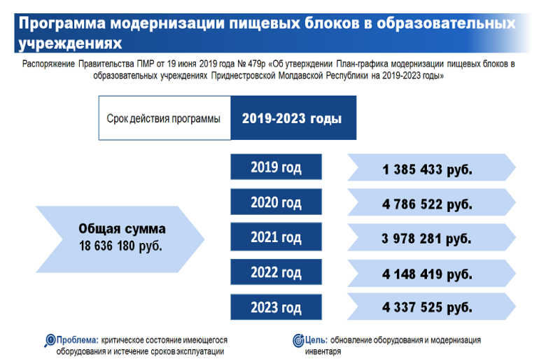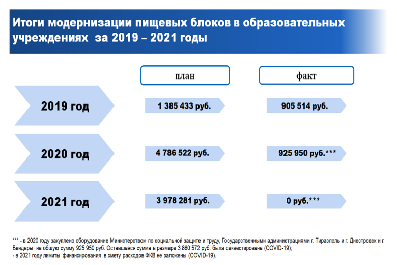 Одна из самых масштабных программ - модернизация пищевых блоков. Она рассчитана на 5 лет. Программа начала действовать в 2019 году, когда для 7 школ закупили оборудование на общую сумму более 900 тысяч рублей. В прошлом году часть денежных ресурсов направили на объекты Минсоцзащиты, госадминистраций Тирасполя и Бендер. Остальные средства секвестировали в связи с распространением коронавирусной инфекции, вызванной новым типом вируса COVID-19.