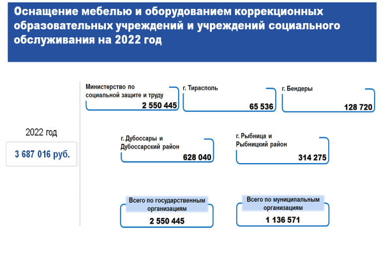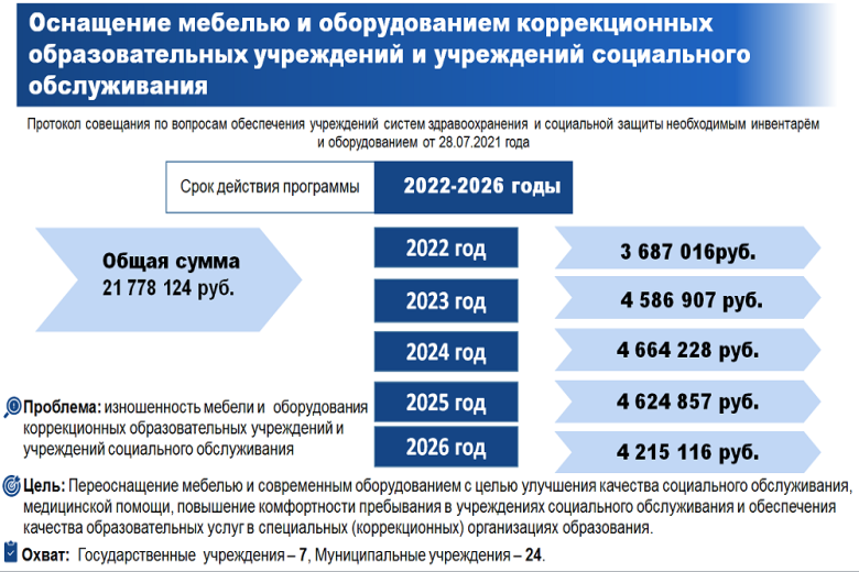 В 2022 году может стартовать и программа оснащения мебелью и оборудованием коррекционных образовательных учреждений и учреждений социального обслуживания. В нее вошли 7 государственных учреждений и 24 муниципальных. В будущем году стартовать могут с 3,6 млн рублей, часть из которых пойдет на государственные, а часть на муниципальные организации. Начало финансирования программы с 2022 года позволит улучшить качество социального обслуживания, медицинской помощи, повысить комфортность пребывания в учреждениях социального обслуживания и обеспечить качество образовательных услуг в специальных (коррекционных) организациях образования.