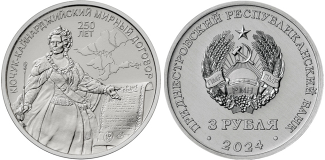 Тирасполь, 21 июля. /Новости Приднестровья/. С 19 июля Приднестровский республиканский банк ввел в обращение новую памятную монету номиналом 3 рубля из серии «Россия в истории Приднестровья». Выпуск посвящен 250-летию Кючук-Кайнарджийского мирного договора.