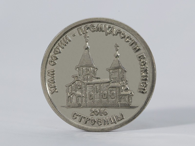 Как сообщает Отдел общественных коммуникаций ПРБ, тираж монеты – 50 тысяч штук. На реверсе монеты в центральной части изображён храм во имя Софии, Премудрости Божией, внизу надпись «Строенцы». Часть памятных монет будет помещена в упаковку-буклет.