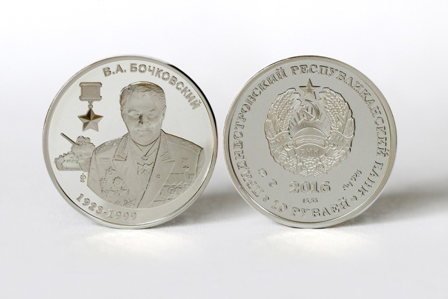 Одна из них «В.А. Бочковский – герой Советского Союза (1923-1999)» серии «Герои Советского Союза в годы Великой Отечественной войны» – в диаметре имеет 33 мм и весит 15,55 г. Тираж данной монеты – 250 штук.