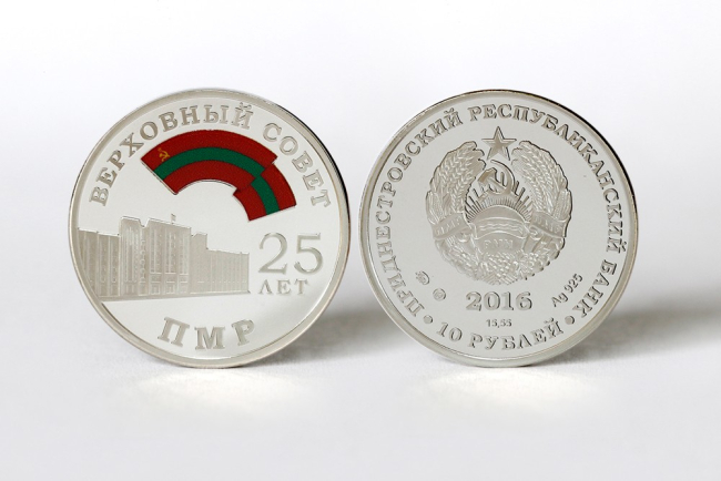 Другая монета «25 лет Верховному Совету ПМР» пополнит серию «Государственность Приднестровья». Денежный знак, выпущенный тиражом 300 штук, в диаметре имеет 33 мм и весит 15,55 г.