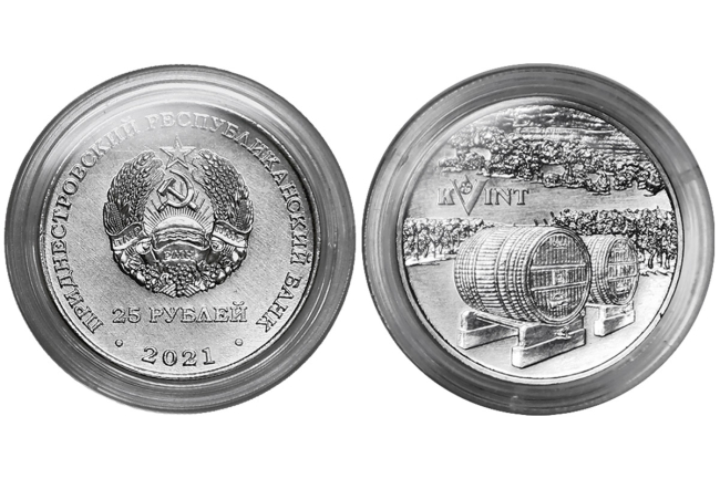 Как сообщается на  официальном сайте ПРБ, новая монета номиналом 25 рублей отчеканена из стали, покрытой белым никелем, тиражом в 2 500 экземпляров. На её лицевой стороне изображены государственный герб ПМР, цифры «2021» и номинал – 25 рублей. На оборотной стороне – изображение винных бочек на фоне виноградников и надпись KVINT.