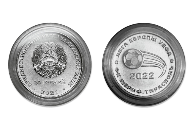 Тирасполь, 27 апреля. /Новости Приднестровья/. Приднестровский республиканский банк ввёл в обращение серию памятных монет ФК «Шериф. Лига Европы УЕФА 2021-2022» серии «Спорт Приднестровья». Монета номиналом 25 рублей изготовлена из стали с покрытием из белого никеля.