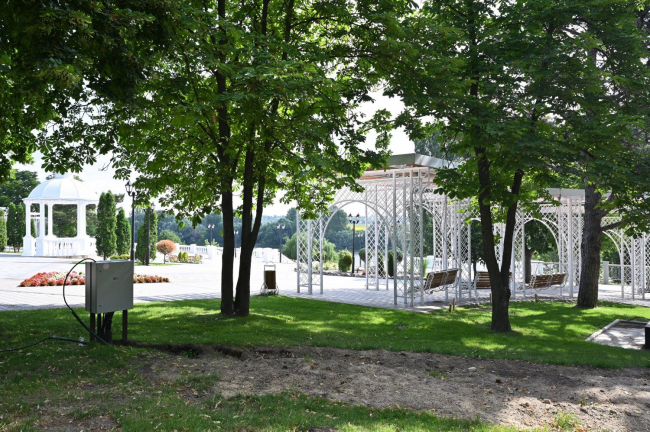 Президенту рассказали, что для левого и правого крыльев парка изготовили много скамеек: 20 классических, 15 так называемых пуфов и одну «змейку», собранную из семи элементов. Кроме этого, есть пять качелей и объект с рабочим названием «ветряк». Освещение боковых зон обеспечат 28 шестиметровых фонарей и 39 - высотой 3,7 метра. Продумано достаточное количество урн. Параллельно ведутся дорожные работы.