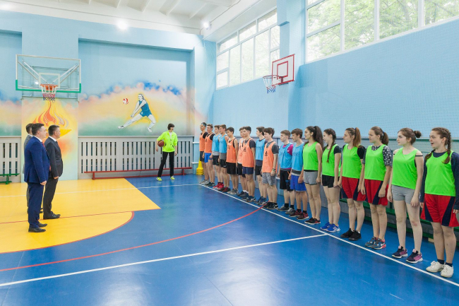 Главе государства рассказали, что помимо проведения уроков физкультуры в спортзале занимаются 42 воспитанника именитого тренера-преподавателя по баскетболу Натальи Свищевой. Вадим Красносельский пожелал тренеру и ее воспитанникам успехов как на спортивном, так и на образовательном поприще.
