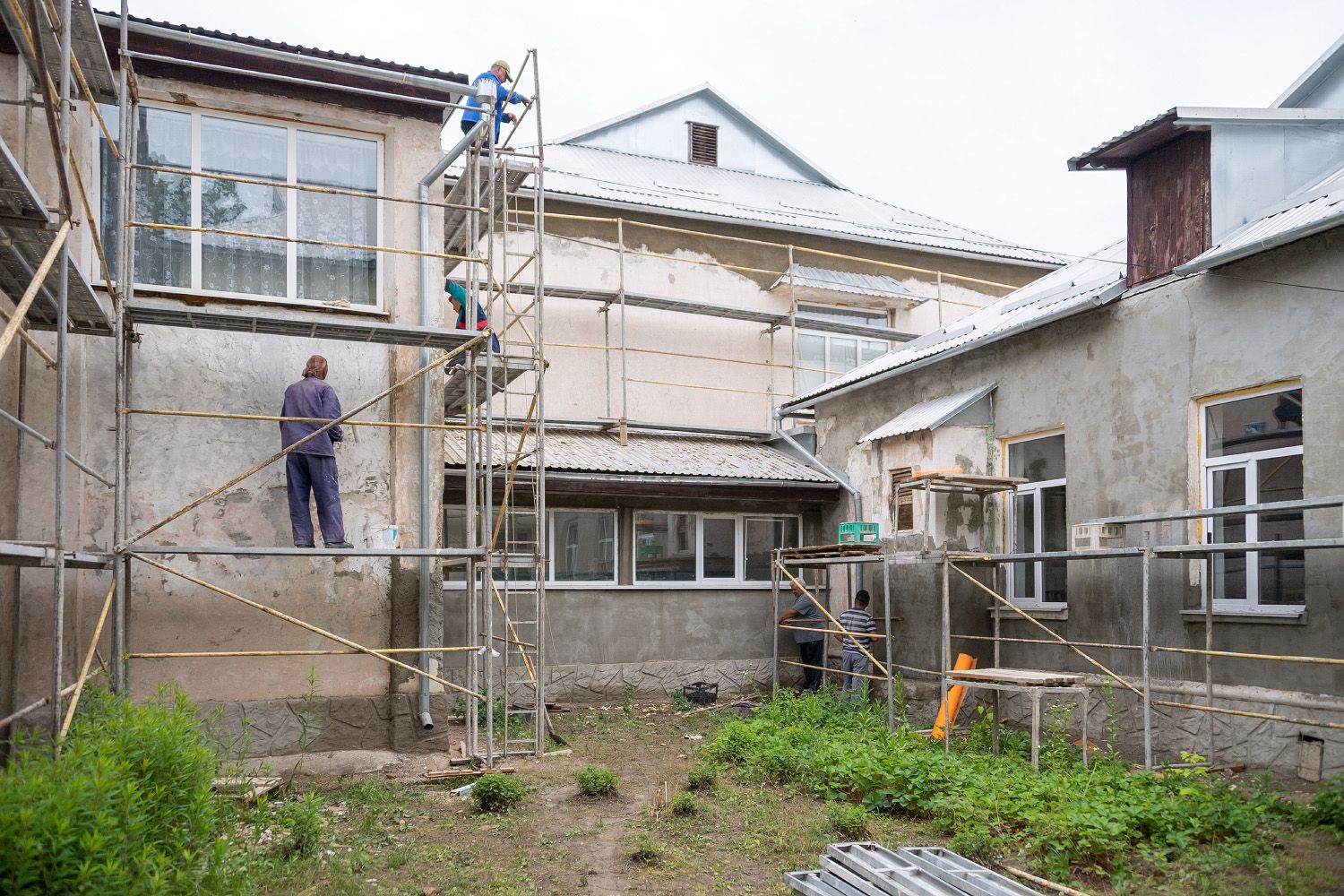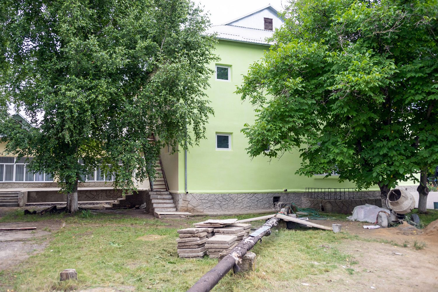 Этот объект ремонтируют за счёт Фонда капвложений. На его обновление выделили миллион рублей. К выполнению работ подрядчик приступил в конце марта. Сейчас здесь ремонтируют фасады корпусов. Цвета для них выбирали коллективно. Уже готовы лиловый и оливковый, скоро приступят к покраске в желтый и малиновый.