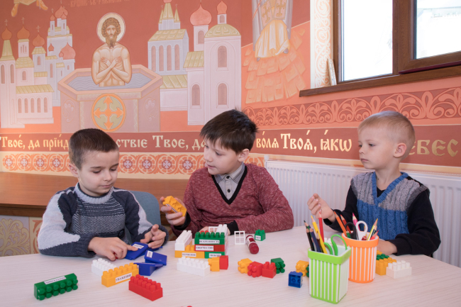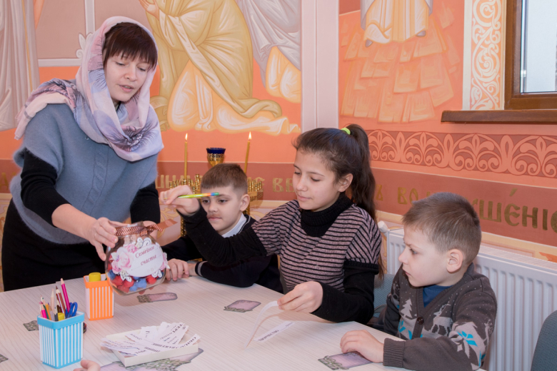 Каждый урок начинается с молитвы, затем педагог даёт ребятам задания. Сегодня дети представили рецепт семейного счастья. У каждого он был свой. Кто-то добавил миллион граммов любви, 100 граммов добра, а кто-то – 100 килограммов молитвы и взаимопонимания. А малыши строили идеальный дом.