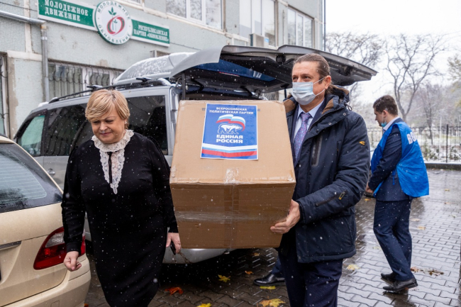 Тирасполь, 1 декабря. /Новости Приднестровья/. Российские парламентарии, находящиеся с визитом в Приднестровье, сегодня передали Приднестровью гуманитарную помощь – средства индивидуальной защиты. Это первая часть масок и перчаток, пояснили депутаты Госдумы от партии «Единая Россия» Артём Туров и Сергей Чижов во время сегодняшней встречи в офисе партии «Обновление». Вторую планируют передать до конца года. Это помощь Приднестровью в борьбе с пандемией коронавируса.