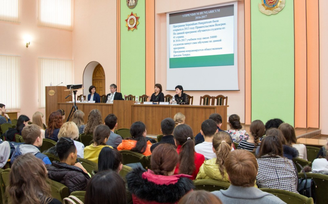 Тирасполь, 29 февраля. /ИА «Новости Приднестровья"/. Сегодня в Приднестровском госуниверситете им. Т.Г. Шевченко советник посольства Венгрии в Молдове Шандор Кешерю представил студентам программу обучения Stipendium Hungaricum. Этот проект предоставляет возможность студентам из разных стран обучаться на бакалавриате, в магистратуре, а также докторантуре в вузах Венгрии на бесплатной основе с выплатой стипендии, сообщает Центр СМИ ПГУ.