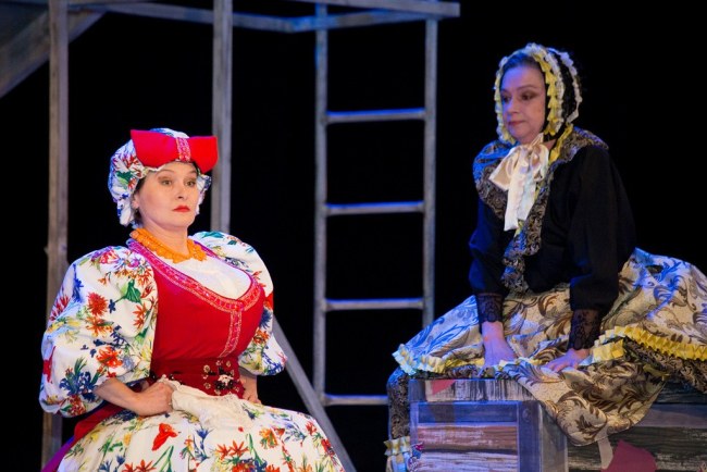 Весьма интересна и импозантна была в роли свахи Наталья Галатонова, которая привнесла в него свою «изюминку» – своеобразный акцент, поданный достаточно смело и одновременно «вкусно». Именно появление свахи не давало сходить с лица улыбкам и быть прикованным к сцене до конца спектакля. Манеры, величина широты ее души (в полном смысле этого слова), а также ярчайший наряд сделали образ более полным и насыщенным.