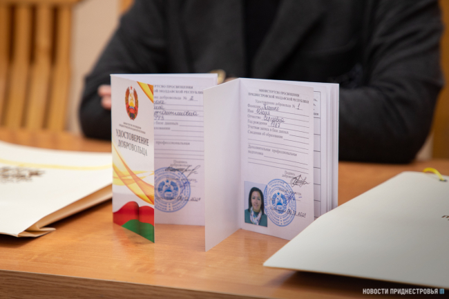 Тирасполь, 6 декабря. /Новости Приднестровья/. Сегодня на площадке Министерства просвещения прошло вручение удостоверений добровольца. Документы вручала министр просвещения Алла Николюк.