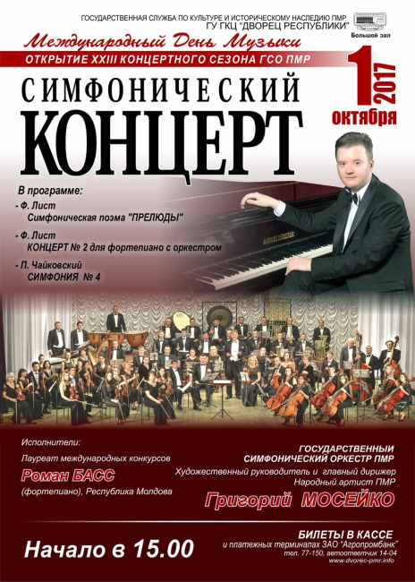 Тирасполь, 18 сентября. /Новости Приднестровья/. В воскресенье, 1 октября – в Международный день музыки, Приднестровский государственный оркестр под управлением Григория Мосейко откроет XXIII концертный сезон. Мероприятие состоится в большом зале ГКЦ «Дворец Республики». В праздничную программу войдут произведения западноевропейских композиторов-романтиков.