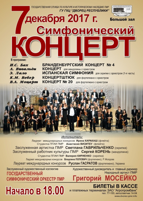 Тирасполь, 4 декабря. /Новости Приднестровья/. В этот четверг, 7 декабря, в большом зале Дворца Республики состоится Вечер инструментального концерта. В его рамках Приднестровский симфонический оркестр исполнит шедевры мировой классики.