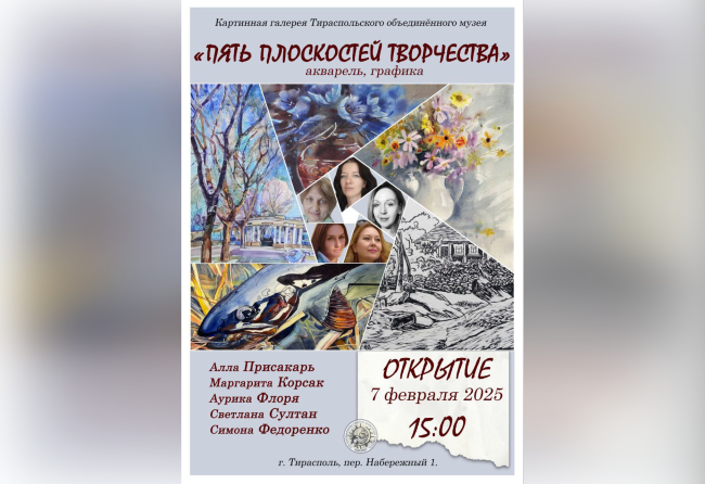 Тирасполь, 6 февраля. /Новости Приднестровья/. 7 февраля в Тираспольской картинной галерее откроется выставка приднестровских художниц «Пять плоскостей творчества». Своими творениями поделятся Алла Присакарь, Аурика Флоря, Симона Федоренко, Маргарита Корсак и Светлана Султан.