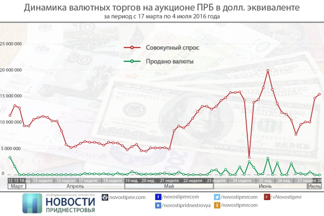 23 июня 2016 года совокупный спрос на торгах валютного аукциона Приднестровского республиканского банка составил в эквиваленте 11 510 073,38 долларов США. Учитывая отсутствие сопоставимого предложения на продажу иностранной валюты со стороны участников валютного аукциона, заявки уполномоченных банков на покупку иностранной валюты по поручению клиентов не были удовлетворены.