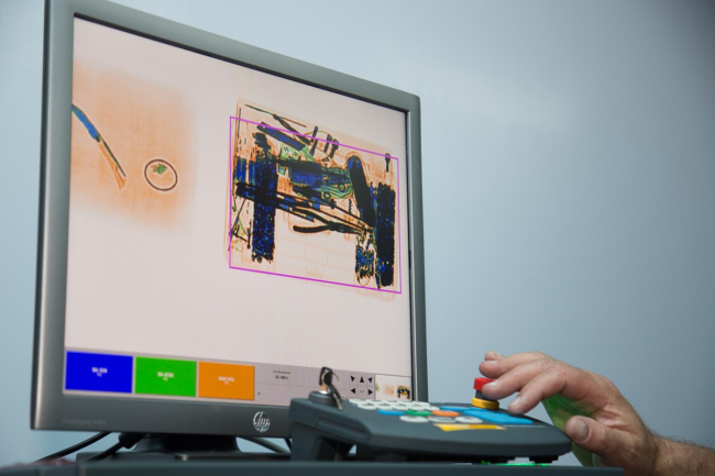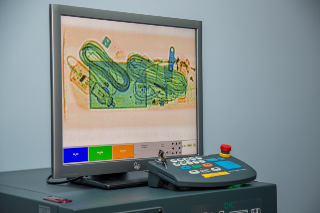 Задача установки – показать содержимое посылки, не раскрывая упаковку. На экране транслируются контуры и очертания предметов разными цветами: оранжевым – органика, зеленым – пластмасса, синим – металлы.