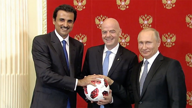 Президент РФ Владимир Путин, эмир Катара Тамим бен Хамад Аль Тани и президент ФИФА Джанни Инфантино поучаствовали в воскресенье в церемонии символической передачи Катару полномочий по проведению чемпионата мира по футболу 2022 года, пишет ТАСС.