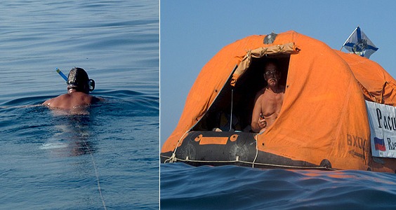 В ходе заплыва россиянин ещё и тащил за собой надувной плот, на котором с провизией и необходимыми принадлежностями находился личный врач, оценивавший физическое состояние пловца и корректировавший курс заплыва.