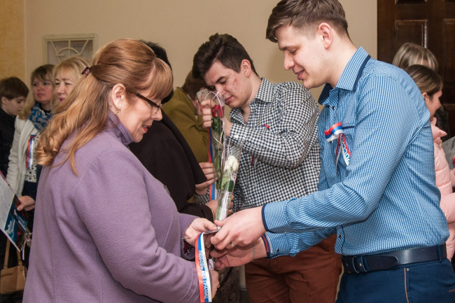 В рамках проекта «Россия – Любовь без границ» каждую девушку и женщину, пришедшую в КПЦ ПГУ им. Кирилла и Мефодия на праздничный концерт, встречали цветами и открытками