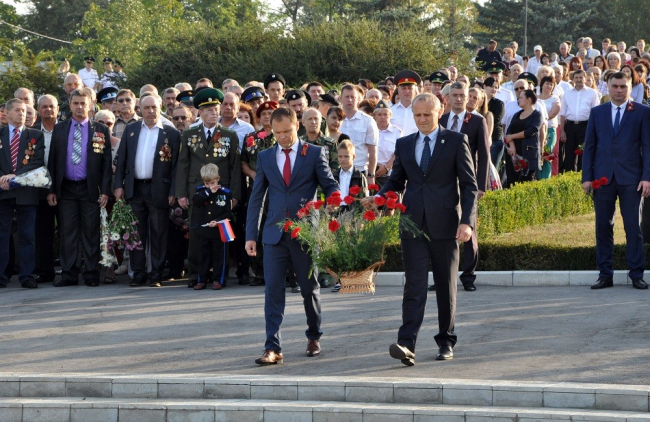 На мемориальном комплексе рыбничане во главе с руководством города возложили цветы к подножью Мемориала Славы защитникам Отечества, Обелиску Славы и памятнику героям Чернобыля. На площади Победы были подняты флаги Приднестровья и России. Здесь же наградили лучших работников различных сфер народного хозяйства и огласили результаты фотоконкурса «Моей семьи моменты счастья».