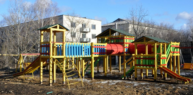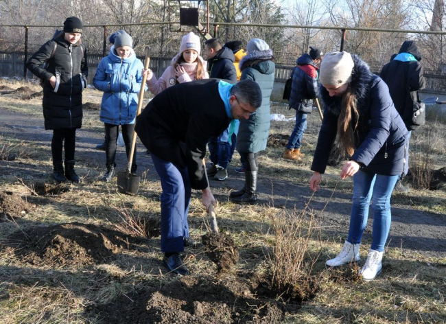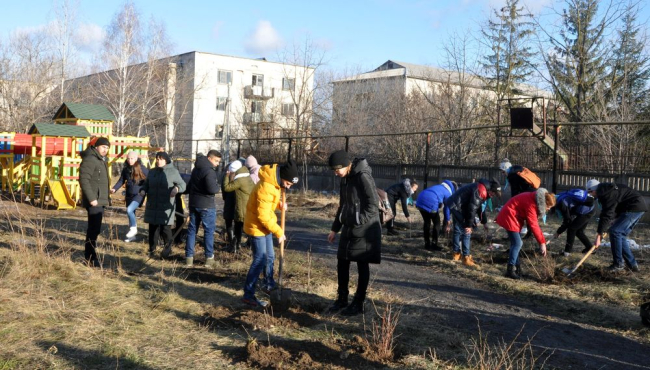 Школьники высадили растения на территории детской игровой площадки, которую установили в канун Дня города по инициативе депутата Верховного Совета Виталия Калина. Будущей весной здесь расцветут французские клены, липы, кёльрейтерии и свыше 70 кустарников спиреи, бересклеты, пираканты.