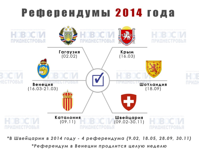 Открыл марафон плебисцитов гагаузский референдум, состоявшийся 2 февраля, следующими на очереди стали крымский и венецианский референдумы. На 18 сентября намечен плебисцит по вопросу независимости в Шотландии. В случае поддержки населением цивилизованного развода с Англией Эдинбург восстановит государственность спустя триста лет после подписания династической унии и подчинения Шотландии британской короне.